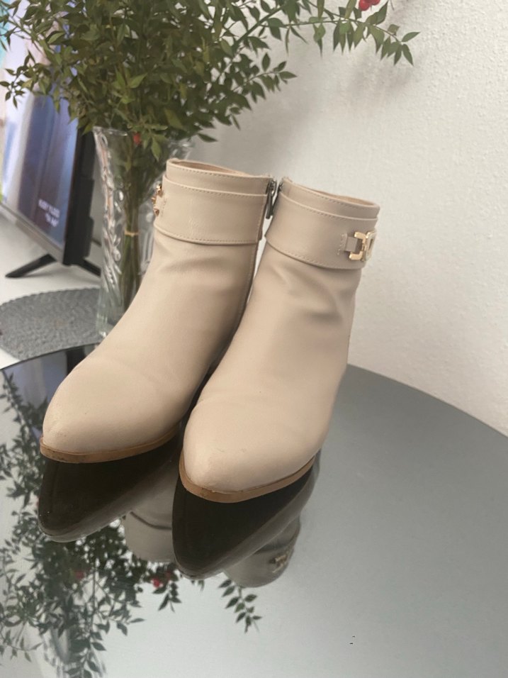 Bej deri, tok topuklu ve tokalı kadın botları, günlük kullanıma uygun çağdaş Paris tarzında. Geri iadem yoktur
