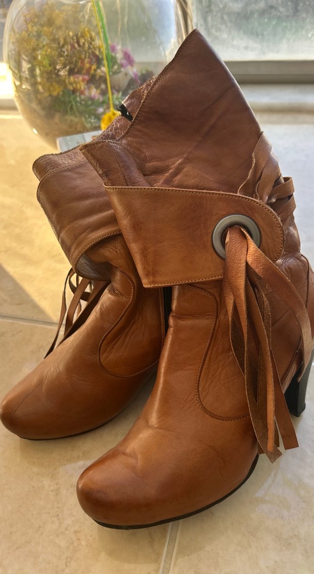 Bej deri, topuklu ve tokalı kadın botları. Yanında püsküllerle bohem tarzı yansıtan parlak tasarım, günlük kullanım için uygundur. Sayılı kullanıldı yeni gibi şık