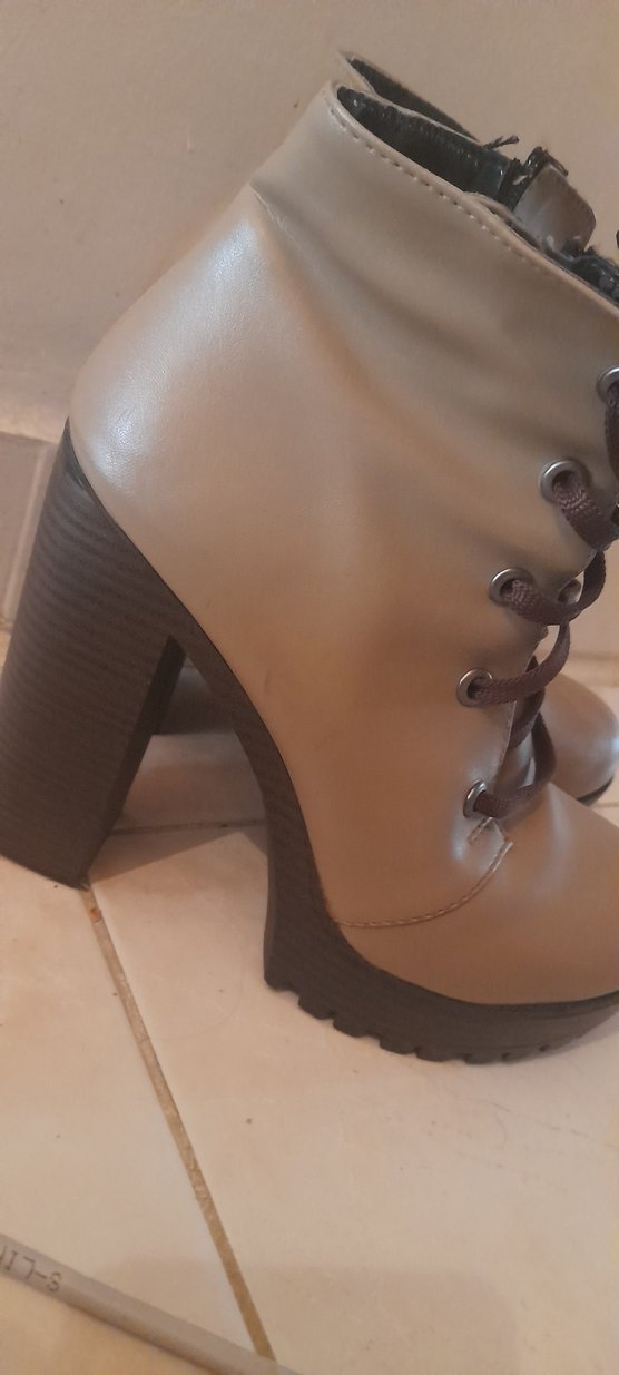 Bej deri kadın bot, kalın topuklu ve tokalı detaylı, günlük kullanıma uygun modern tasarım