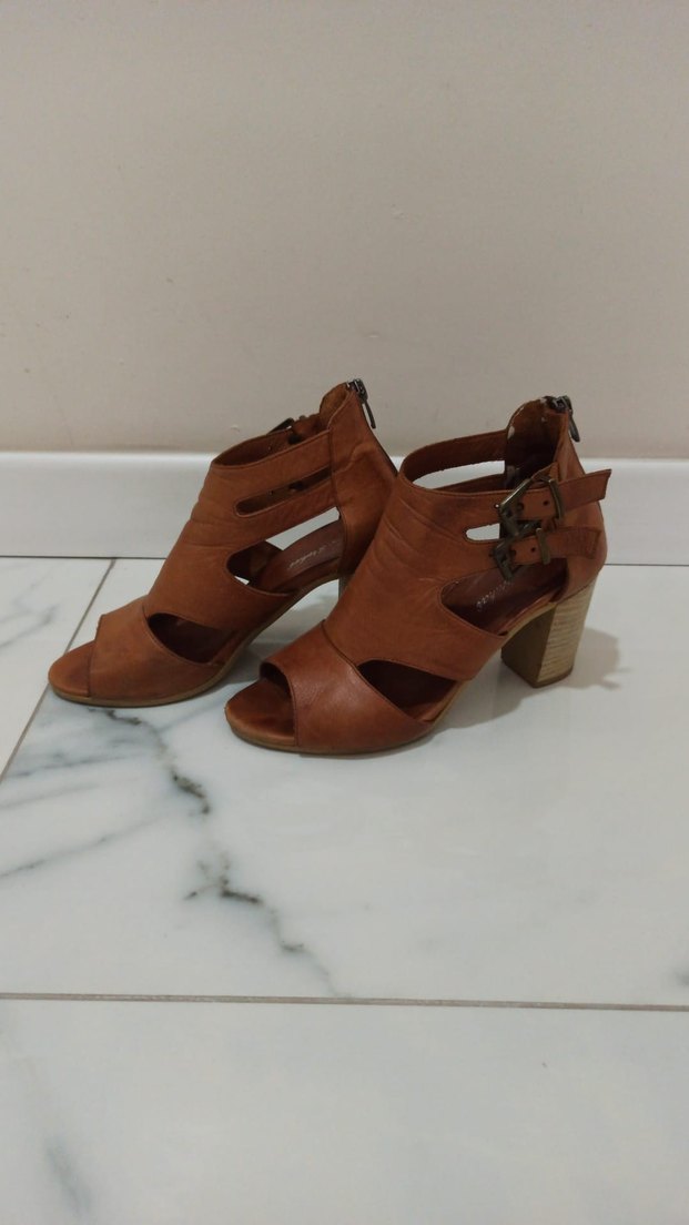 Bej deri blok topuklu kadın sandalet, tokalı kayışlarla minimalist ve çağdaş tasarım, günlük kullanım için uygundur.