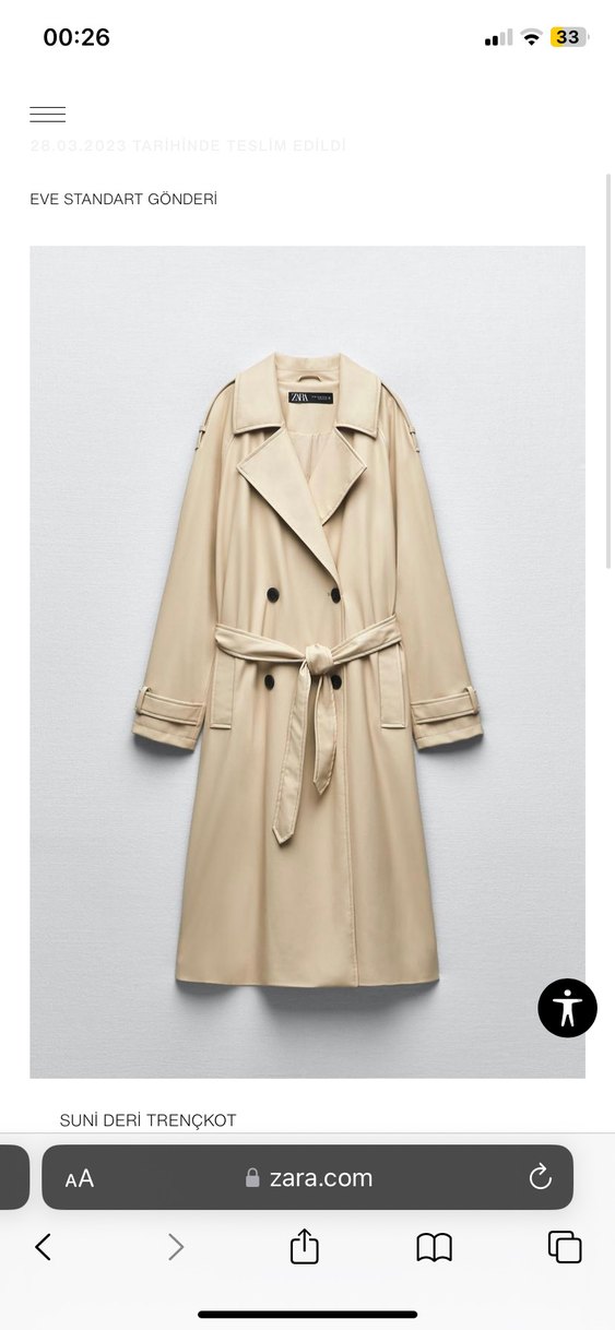 Bej renkte deri trençkot, kemerli ve kesik yakalıdır. Uzun boy, regular fit ve askılı kollu, günlük kullanıma uygun minimalist klasik tarzda.