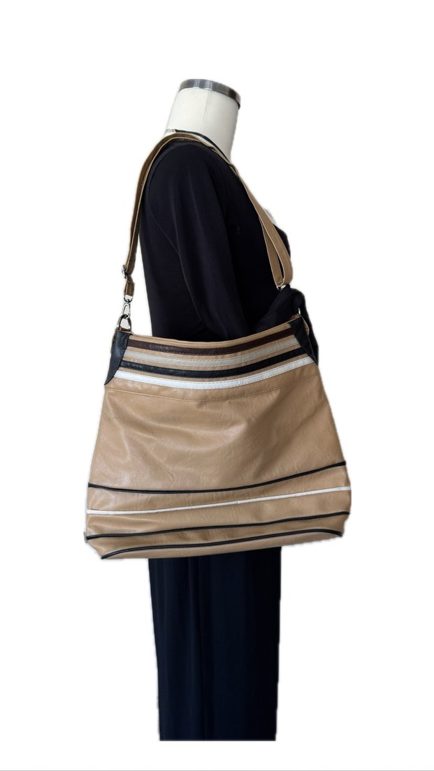 Gri zebra desenli, fermuarlı bej deri kadın çanta, çağdaş Paris tarzıyla trend gündelik kullanıma uygun.