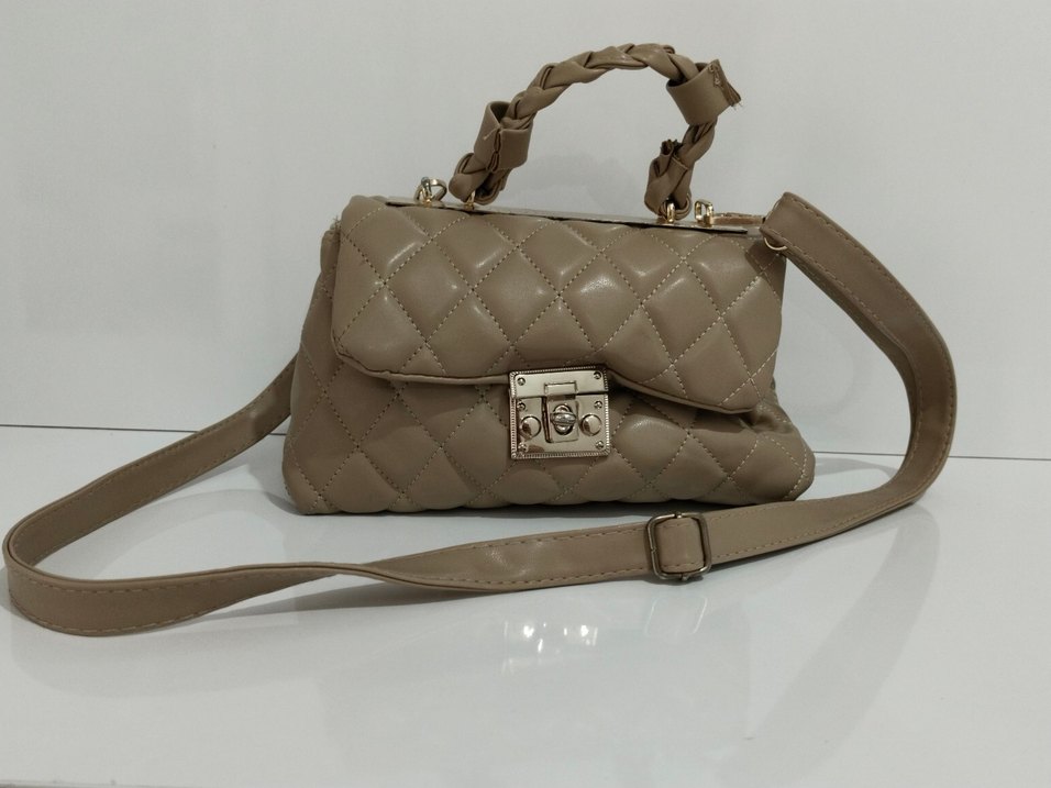 Bej deri kapitone desenli, tokalı kapama detaylı kadın çanta, modern klasik stil ve Paris şıklığını yansıtıyor. Parlak yerinde biraz çizik var