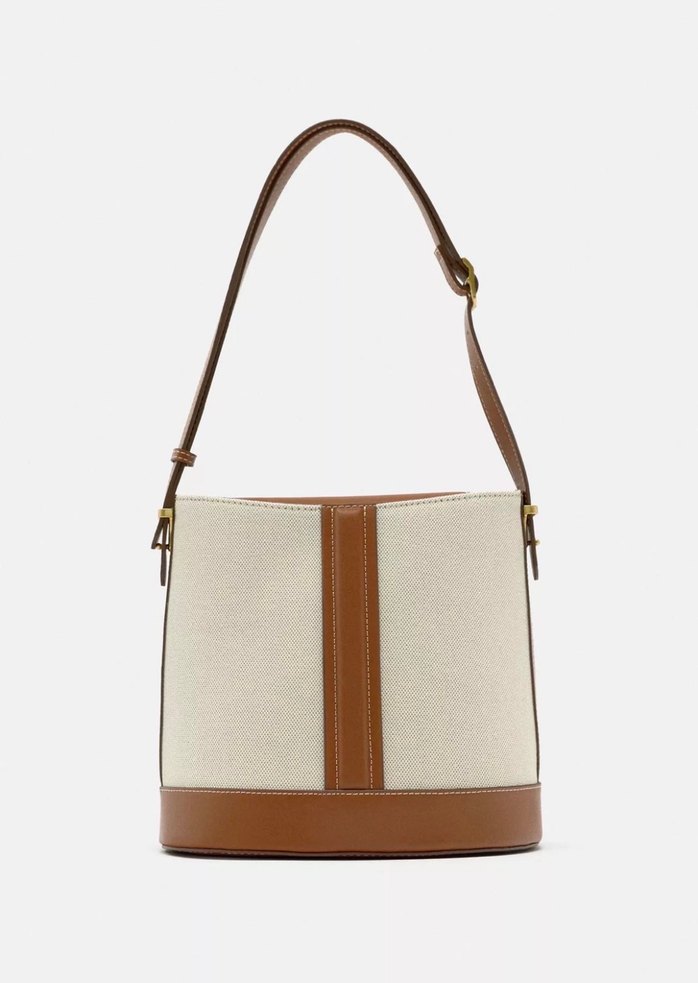 Bej deri kemer detaylı kadın çanta, minimalist ve çağdaş tasarıma sahip. Hafif ve desensiz, günlük kullanım için uygun.