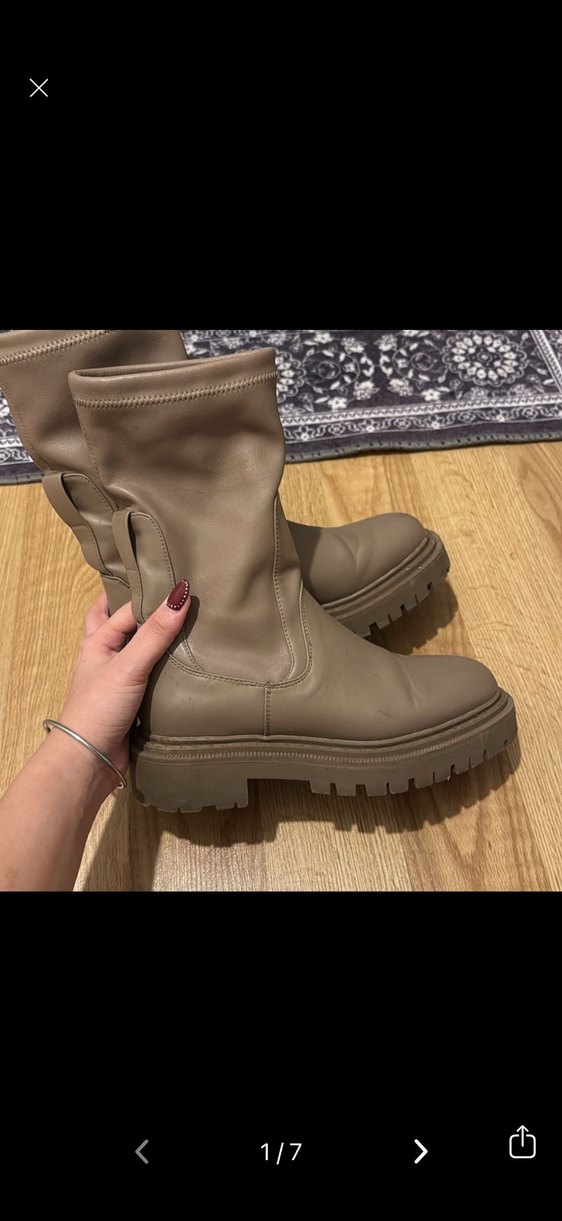 Bej deri, kemer detaylı dizüstü kadın botları, blok topuklu. Günlük sokak stili için rahat ve şık bir seçenek.
