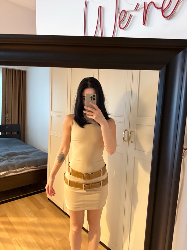 Bej deri midi elbise, dar kesim ve askısız yakaya sahip, çift kemer detayları ile cesur bir tarz sunar. Günlük kullanıma uygundur.