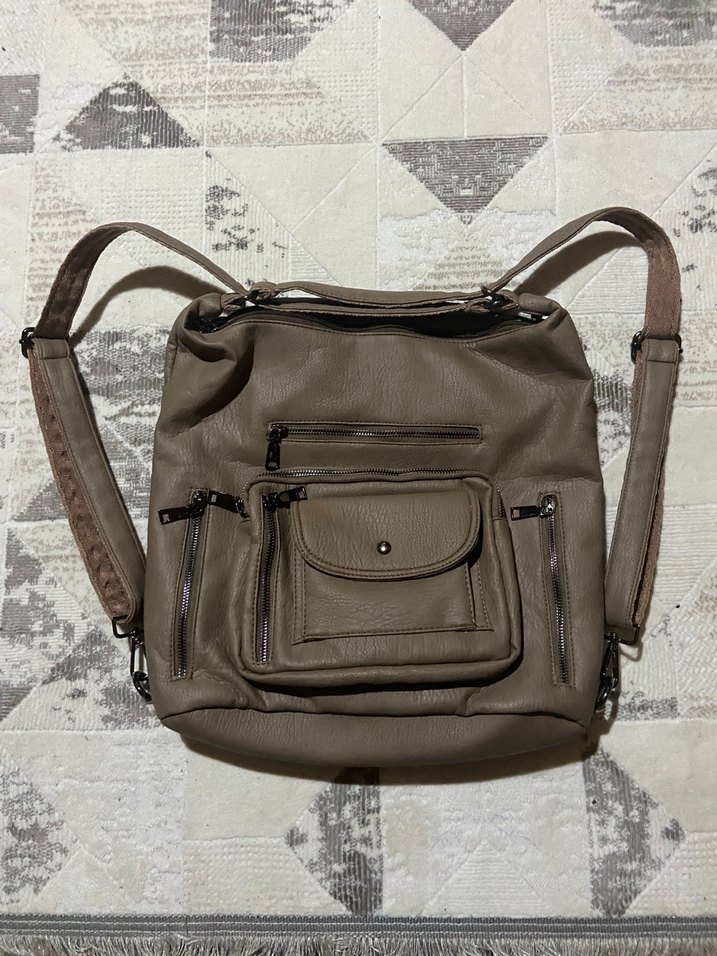 Bej deri kemerli kadın çanta, çoklu fermuarlı cepler ve ayarlanabilir askılı. Hesabımda daha fazla çanta modeli de bulunmakta. Hiçbir sorunları yok; elime fazla geldiği için satıyorum. Şimdiden alana hayırlı olsun