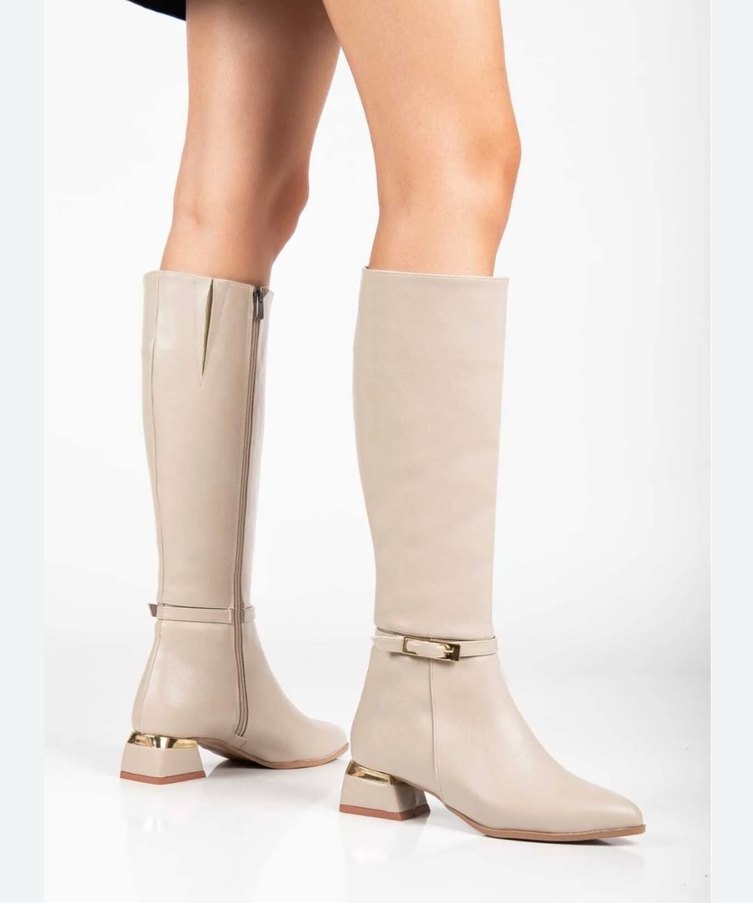 Bej deri dizüstü çizme, kemerli detay ve ince topuklu, minimalist ve çağdaş tarzda, günlük kullanıma uygun.