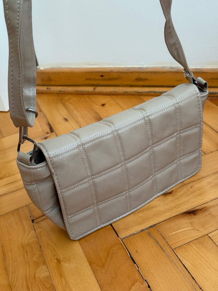 Bej deri kemerli kadın çanta, gri tonlarıyla modern ve günlük kullanıma uygun şık bir tasarıma sahiptir.