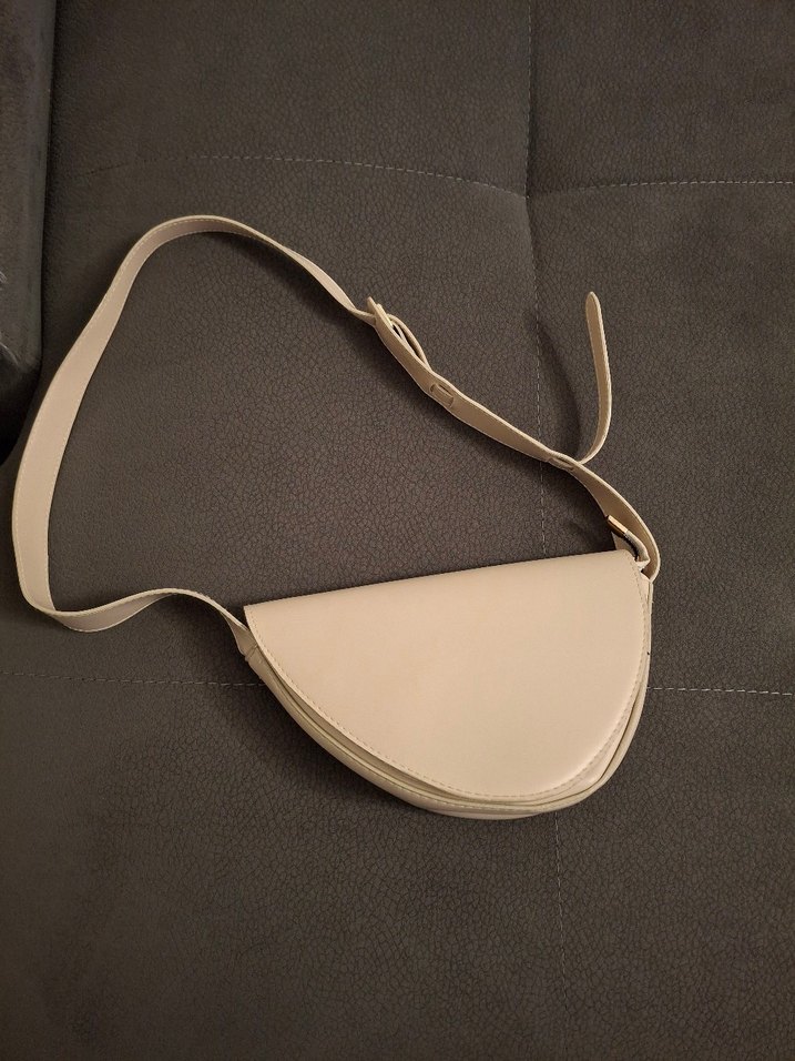 Bej deri, kemerli ve desen içermeyen kadın çantasıdır. Minimalist tarzıyla sokak modasına ve günlük kullanıma uygundur. iki kez kullanıldı
