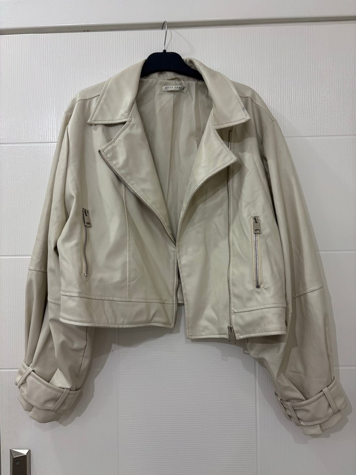 Bej deri, kemerli, kısa kesim kadın ceket. Geniş yaka, askılı kollar ve regular fit ile günlük kullanıma uygundur.