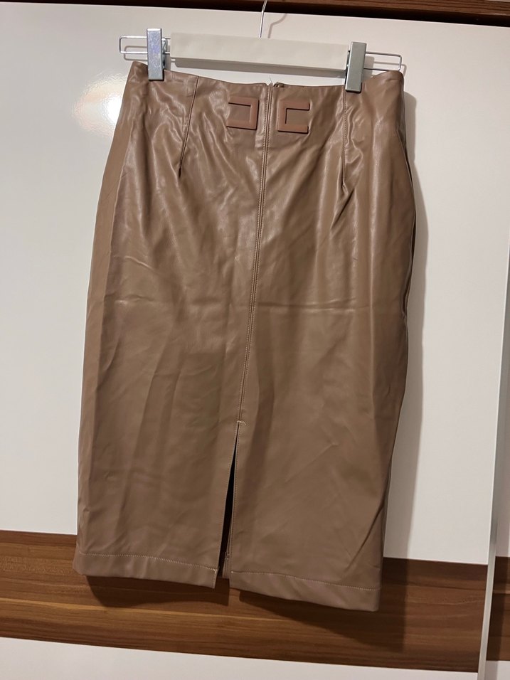 Bej renkli, deri, kemerli ve vücuda oturan midi kadın şort. Parlak yüzeyi ile ofis ve iş stiline uygun, desen içermeyen avant-garde tasarım. Fransadan alındj