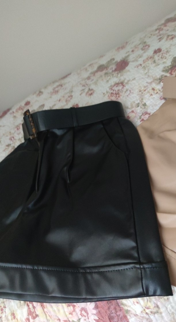 Bej renkte, kemerli ve bol kesim deri mini şort. Günlük kullanıma uygun, rahat sokak stili için ideal. ikisi bir arada