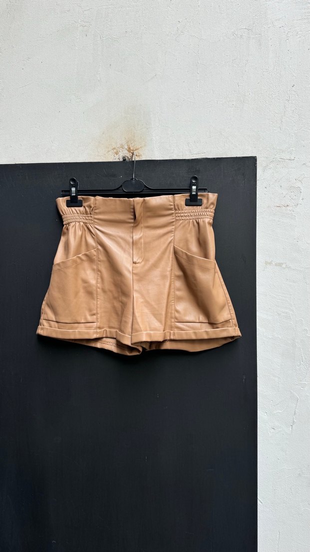 Bej renkte, kemerli ve bol kesim deri mini şort. Minimalist ve trend günlük tarz için uygundur, desensiz ve rahat bir tasarıma sahiptir.
