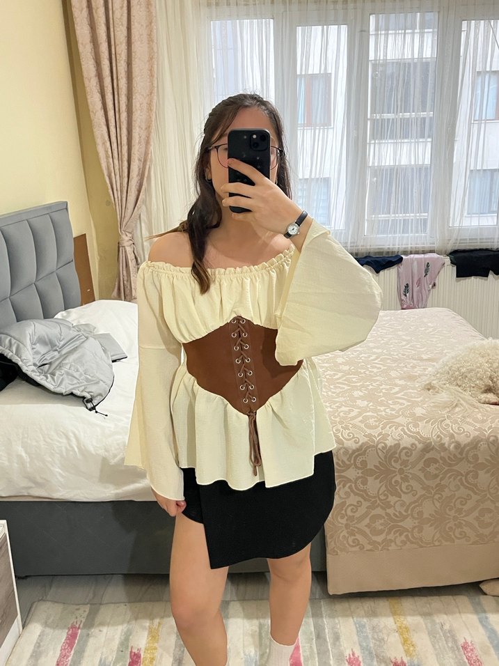 Bej renkli, uzun kollu straplez bluz, kahverengi deri kemerle tamamlanmış, bol kesim ve midi boyda, günlük kullanım için uygundur. ✨