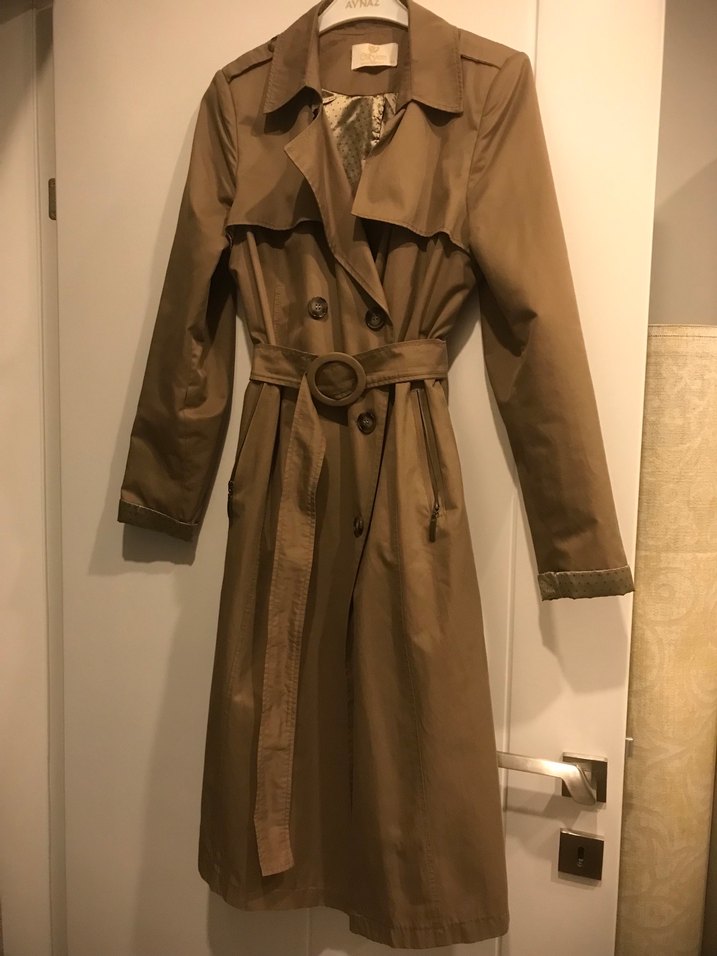 Bej renkte, ara boy trençkot, kemerli ve kesik yaka detaylıdır. Ofis şıklığı için uygun, düzenli kesim ve askılı kollara sahiptir.