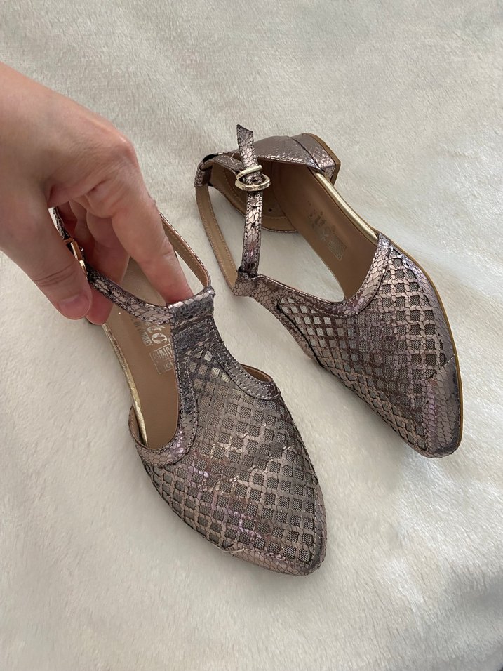 Bej deri, yılan desenli ve kemerli blok topuklu kadın ayakkabısı. Vintage ve çağdaş tarzı bir araya getirir. 36 no sorunsuz