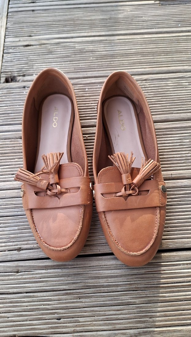 Bej deri kız çocuk loafer ayakkabı, tokalı püsküllü ve parlak görünümlü. Aldo markalı, bohem tarzda şık ve rahat bir model.