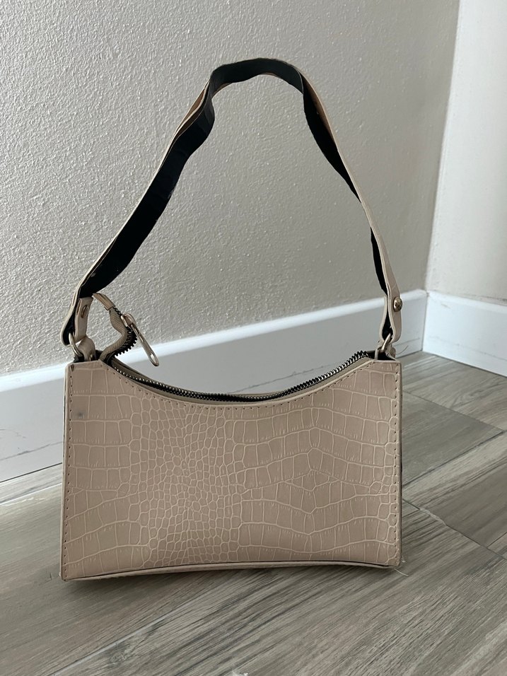 Bej renkli deri kadın çantası, krokodil desenli ve tokalı askılı, trend sokak stiline uygun.