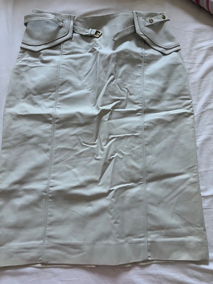 Bej deri midi hamile eteği, kemerli ve regular fit. Ofis kullanımı için uygun, minimalist sokak stili tasarım.