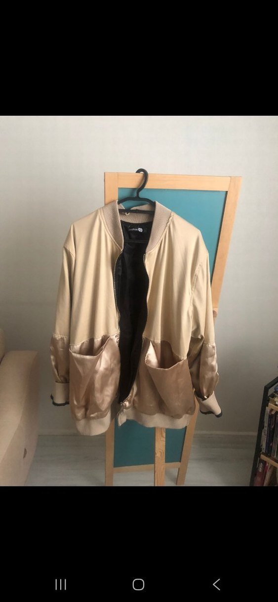 Bej deri ceket, bol kesim ve uzun kollu, yakasında kesik detay bulunur. Parlak yüzeyiyle sade ve günlük kullanıma uygundur.