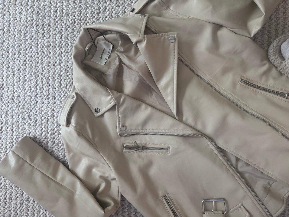 Bej deri midi kadın ceket, çıtçıtlı yakası ve fermuarlı detayları ile regular fit ve askılı kollara sahip. Günlük kullanıma uygun, trend casual tarzda.