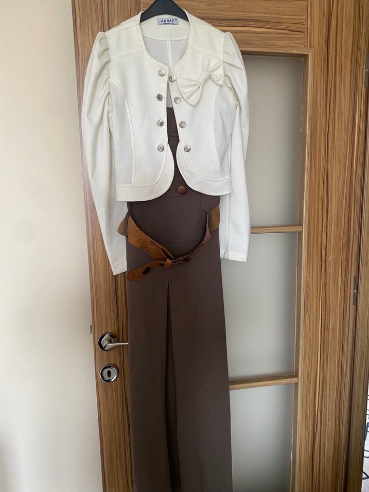Bej renk deri midi uzunlukta, regular fit kadın takım elbise. Kemerli, askılı kollu, ofis için uygun, yakası kesimli ve desensiz tasarım.