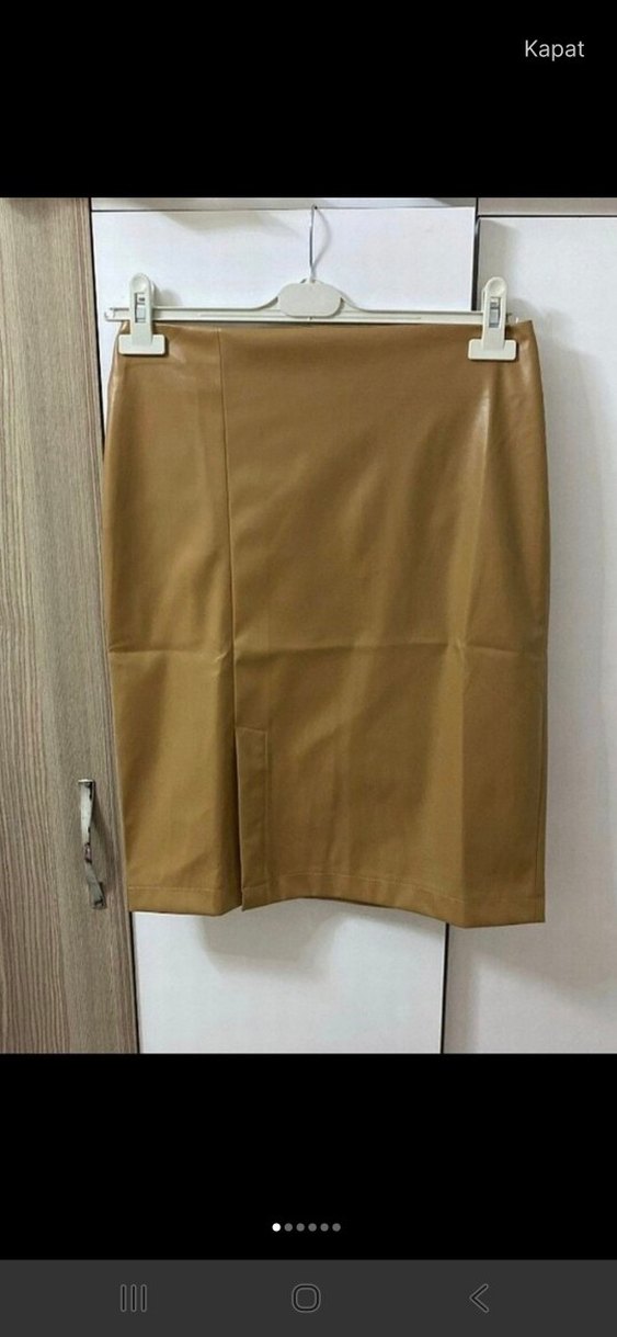 Bej deri midi kalem etek, kemerli ve parlak görünümlü, normal kesim, ofis için uygun.