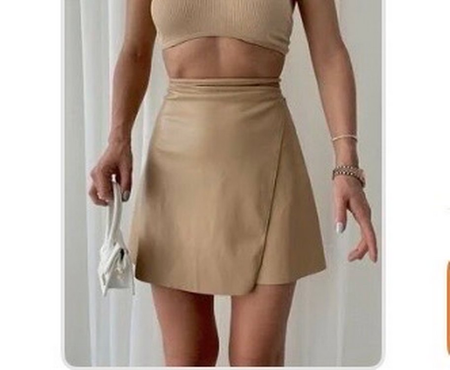 Yumuşak deri kumaştan yapılmış, kemerli ve vücuda oturan bej midi etek, Paris sokak modasına uygun.