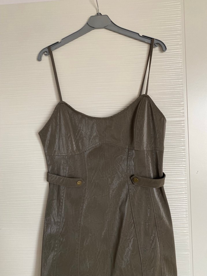 Bej Deri Mini Elbise, Askılı ve Kemerli