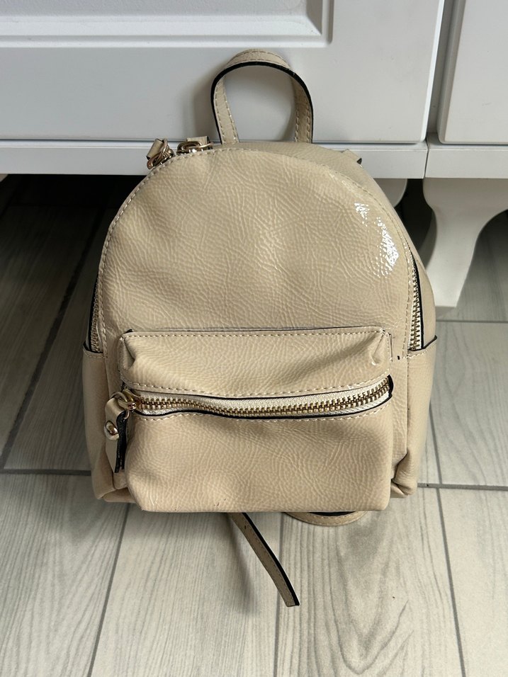 Bej deri, fermuarlı cepleri olan, düz ve desensiz tasarıma sahip günlük kullanım ve sokak stili için uygun sırt çantası. Çok küçüktür. Herhangi bir kusuru yoktur.