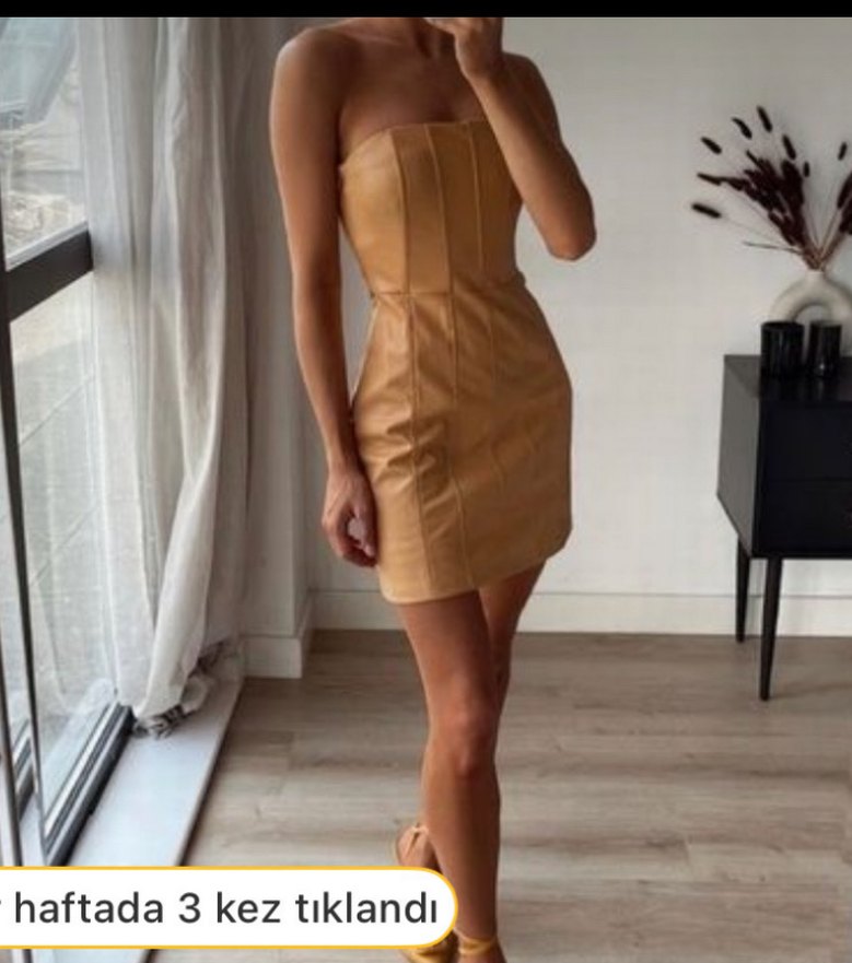 Bej renkli deri mini elbise, straplez ve dar kesimdir. Parlak dokusu ve ince askılarıyla zahmetsiz şıklık sunar, romantik buluşmalar için uygundur. Desensiz ve çağdaş tarzda. ✨