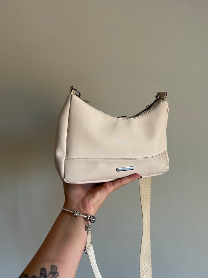 Bej renkli, fermuarlı deri kadın çantası. Minimalist ve desensiz tasarımıyla günlük kullanıma uygundur. Trendy casual tarzı tamamlar.