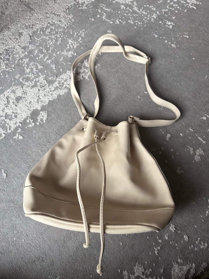 Bej deri kadın çanta, desen içermeyen minimalist tasarımı ve ayarlanabilir askısıyla gündelik şıklık sağlar.