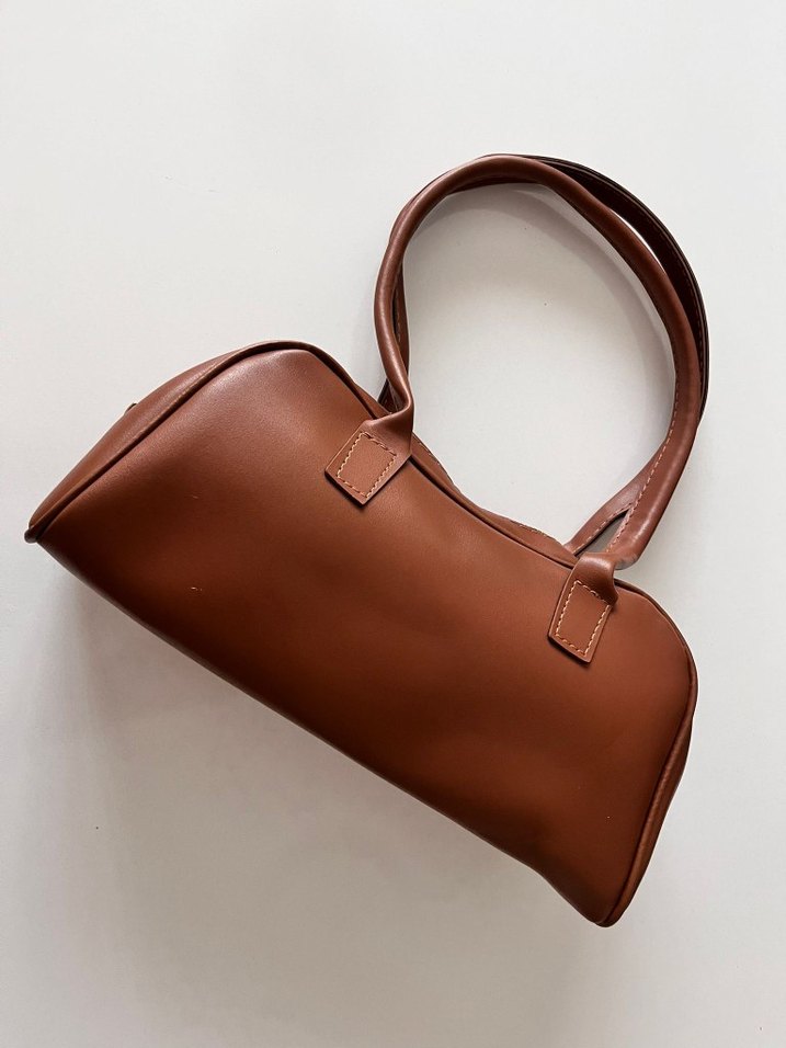 Parlak bej deri, minimalist tasarımlı kadın çanta, günlük kullanım için çağdaş ve zahmetsiz şıklık sunar.