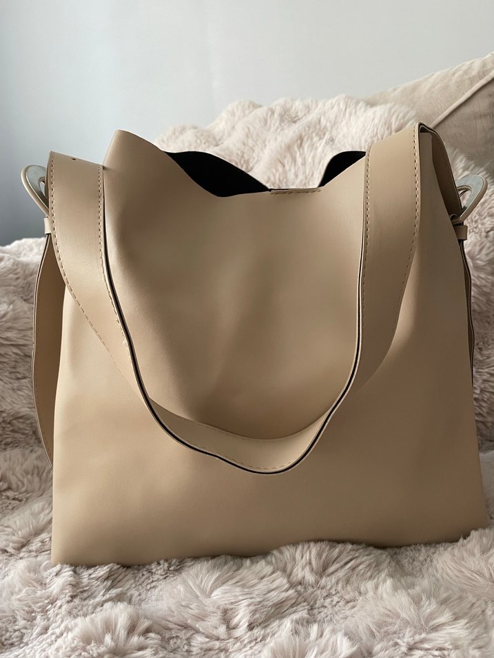 Bej deri çanta, minimalist tasarımı ve desen içermeyen yüzeyiyle dikkat çeker. Günlük kullanıma uygun çağdaş ve şık bir modeldir.