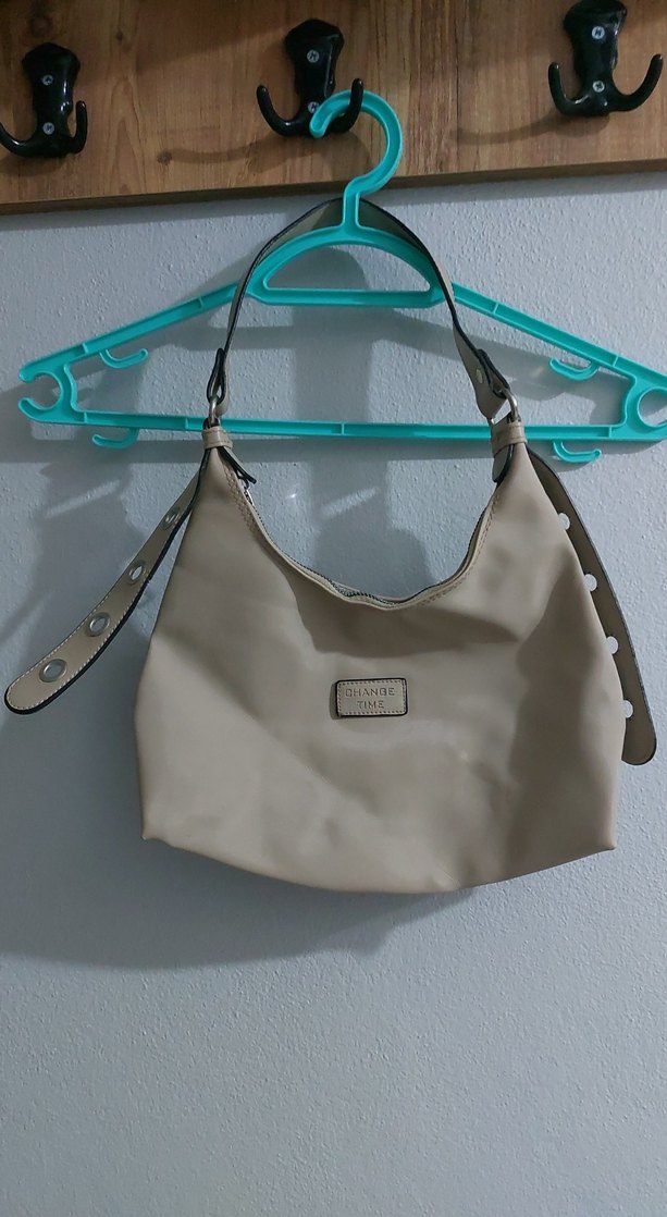 Bej renkli deri kadının omuz çantası, minimal tasarıma sahip ve tokalı kayışları bulunur. Günlük kullanıma uygun, trend sokak stiline hitap eder.