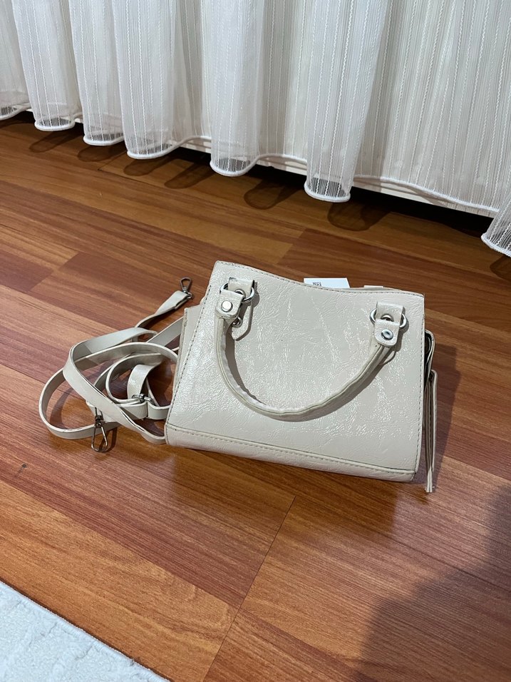 Bej renkte deri, tokalı modern klasik tarzda günlük kullanıma uygun kadın çantasıdır. Gri tonlu ve desensiz yüzeye sahiptir.