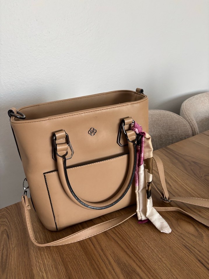 Bej renkli çanta, tokalı sapları ve pastel renkli eşarp detayıyla modern klasik tarza sahip, günlük kullanıma uygun.
