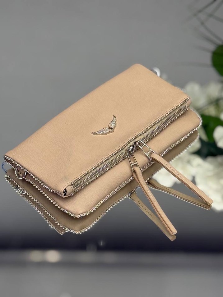 Nakışlı detaylı, fermuarlı bej deri çapraz çanta. Günlük sokak tarzına uygun, minimalist ve açık renk tasarım.