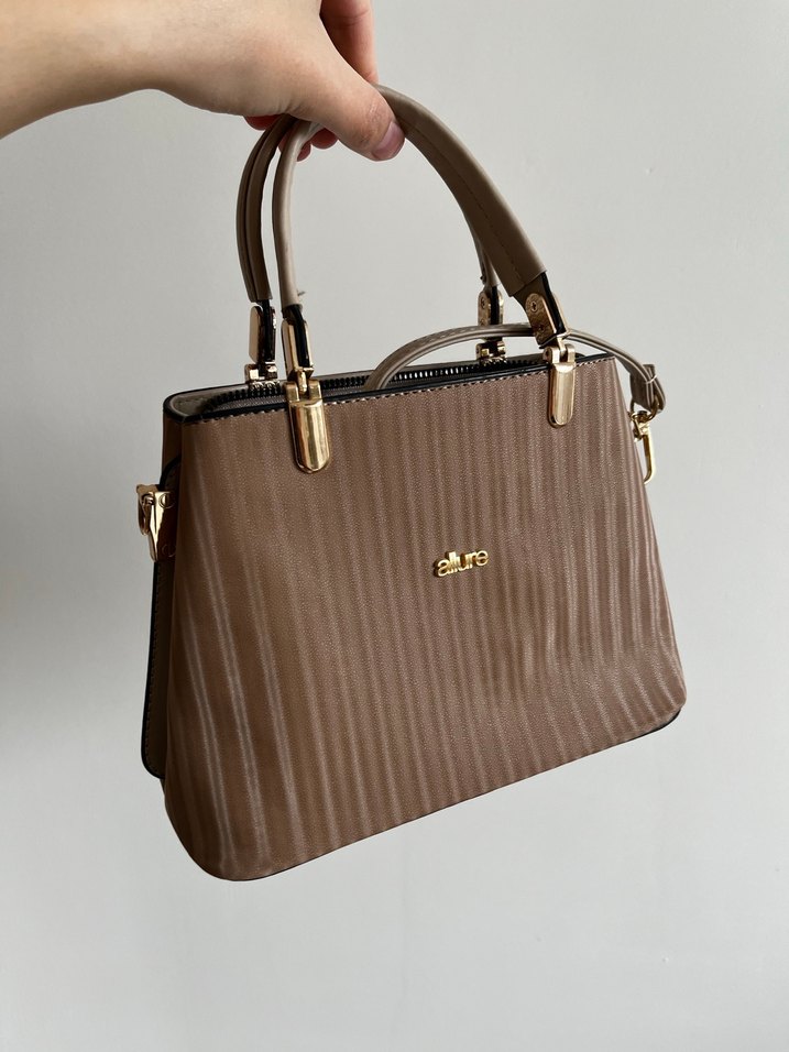 Bej deri, pilili ve parlak yüzeye sahip kadın çanta, modern klasik ve Paris tarzını yansıtır. Günlük kullanım için uygundur.