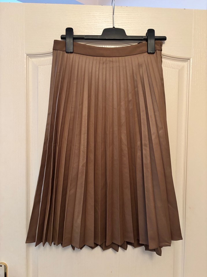 Bej renkli, deri malzemeden yapılmış, pilili detaylara sahip uzun etek. Düzenli kesimi ve çağdaş tarzıyla ofis için uygundur.