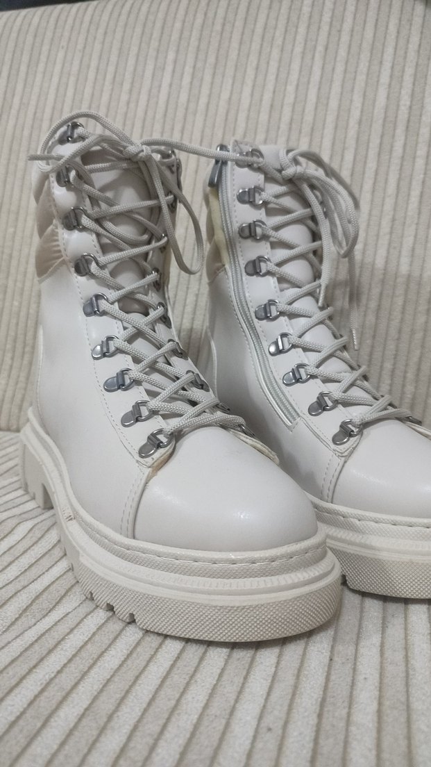 Bej deri kadın botları, platform topuklu ve bağcıklı tasarıma sahip. Sokak tarzı ve günlük kullanım için uygun, desensiz ve gri bağcık detaylı.