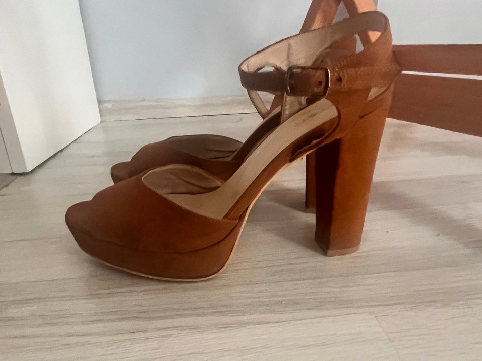 Bej deri platform topuklu, parlak görünümlü ve tokalı kayışlı, klasik zarafet için uygun kadın ayakkabısı. Mezuniyetimde giymiştim inanılmaz rahat bir ayakkabı küçücük k kusurları var diye bu fiyattan