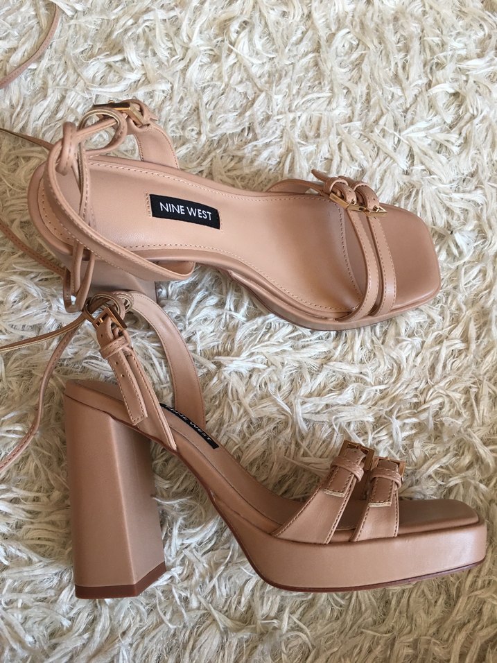 Bej deri platform topuklu, tokalı Nine West kadın ayakkabısı. Bohem tarzıyla romantik akşamlar için uygun, desensiz ve pastel tonlarda.