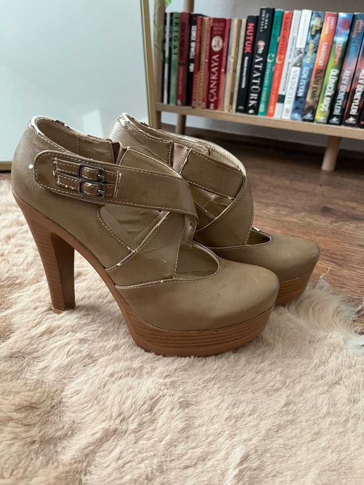 Bej deri platform topuklu kadın ayakkabı, tokalı detaylarla vintage ve çağdaş tarzı birleştirir. Romantik akşamlar için uygundur.