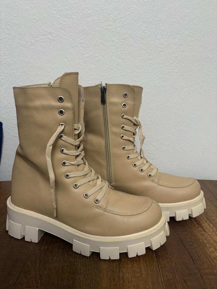 Bej deri platform topuklu botlar, sokak stiline uygun. Bağcıklı ön ve yan fermuarlı, günlük kullanıma uygun şık ve rahat bir tasarım sunar.