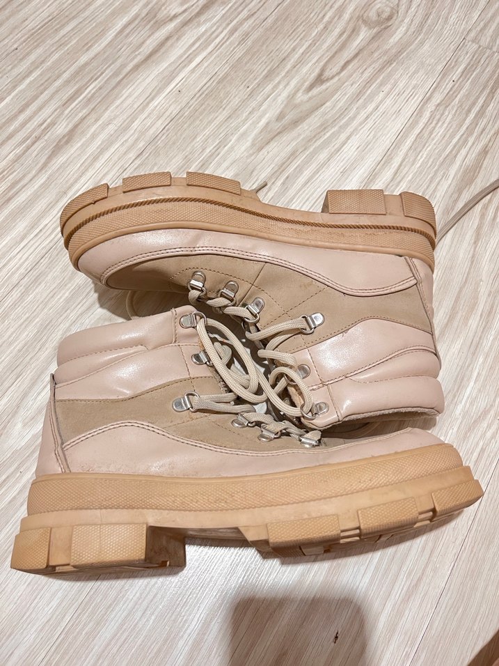 Bej deri platform topuklu kadın botlar, tokalı detaylarla günlük kullanıma uygun rahat ve trend bir görünüm sunar.