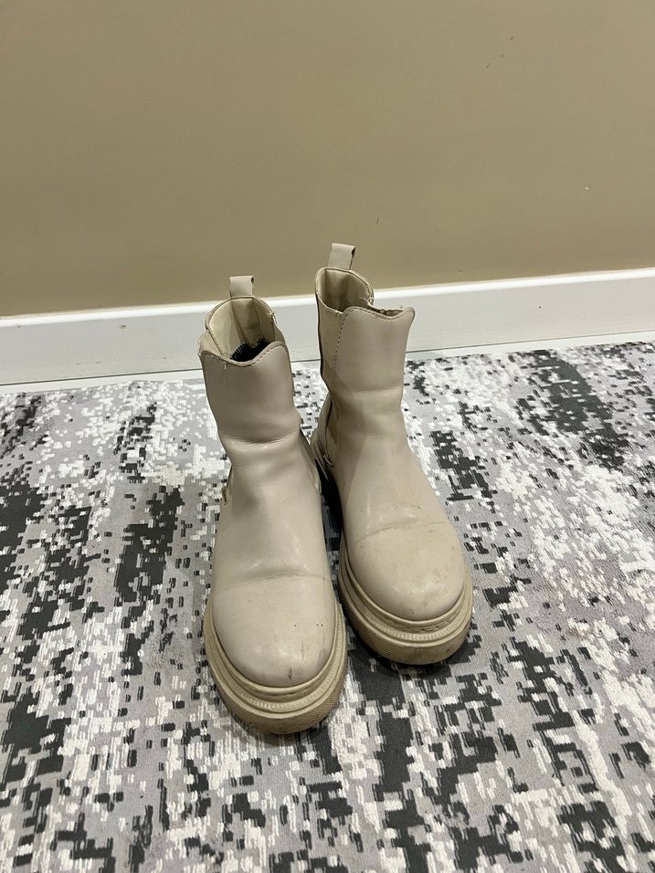 Bej deri platform topuklu kadın botları, desen içermeyen sade tasarımıyla günlük kullanıma uygun, zahmetsiz şıklık sunar. Trendy casual tarz için idealdir.