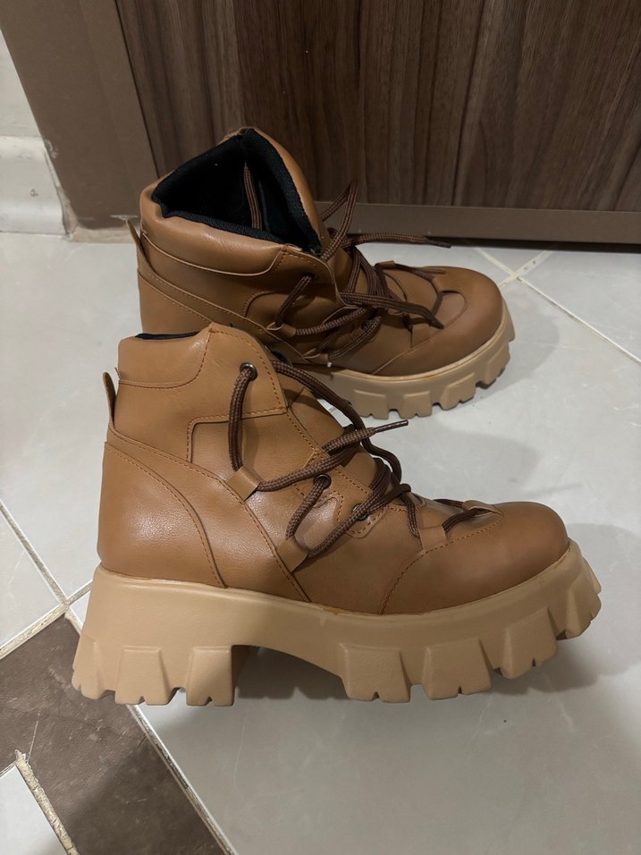 Bej deri kadın botları, kalın platform topuk ve tokalı detaylara sahip, günlük sokak stiline uygun rahat tasarım. Desensiz ve şık görünümlü.